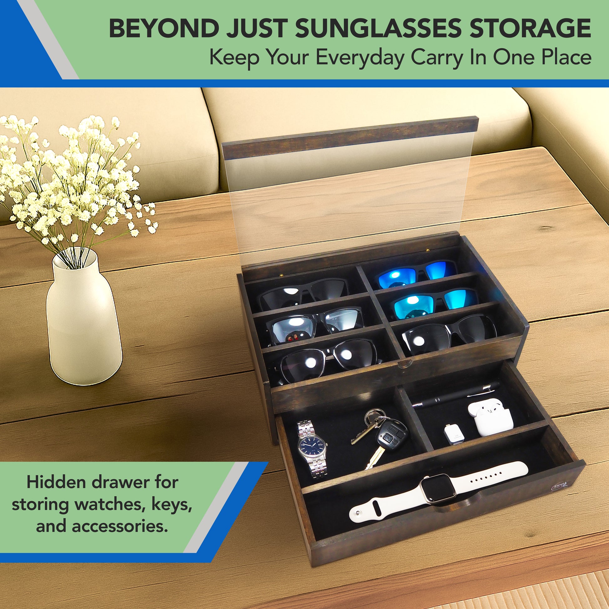 🧰 Beyond Just Sunglasses – More than a sunglass display case, our organizer includes a hidden drawer with compartments for watches, keys & accessories. A clutter-free solution for multiple everyday carry, keeping everything neat, visible & grab-ready.