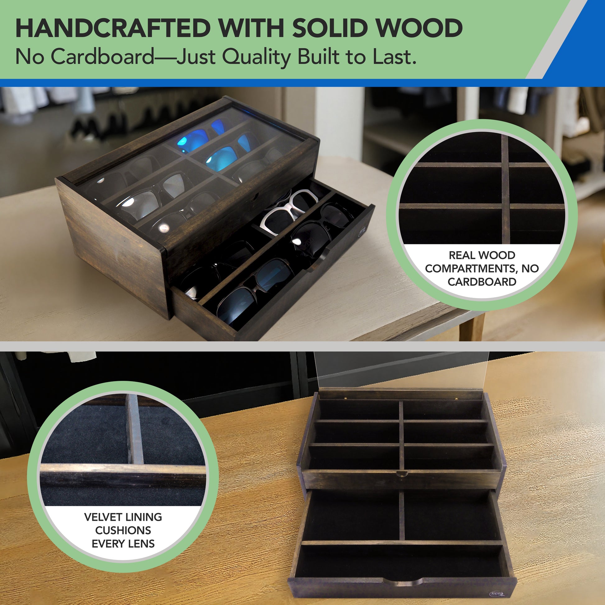 🪵 Built to Impress – Handcrafted from solid wood with velvet-lined compartments, our glasses organizer for men or women is free from cardboard and built to last. A premium display case for those who value true craftsmanship and timeless design.