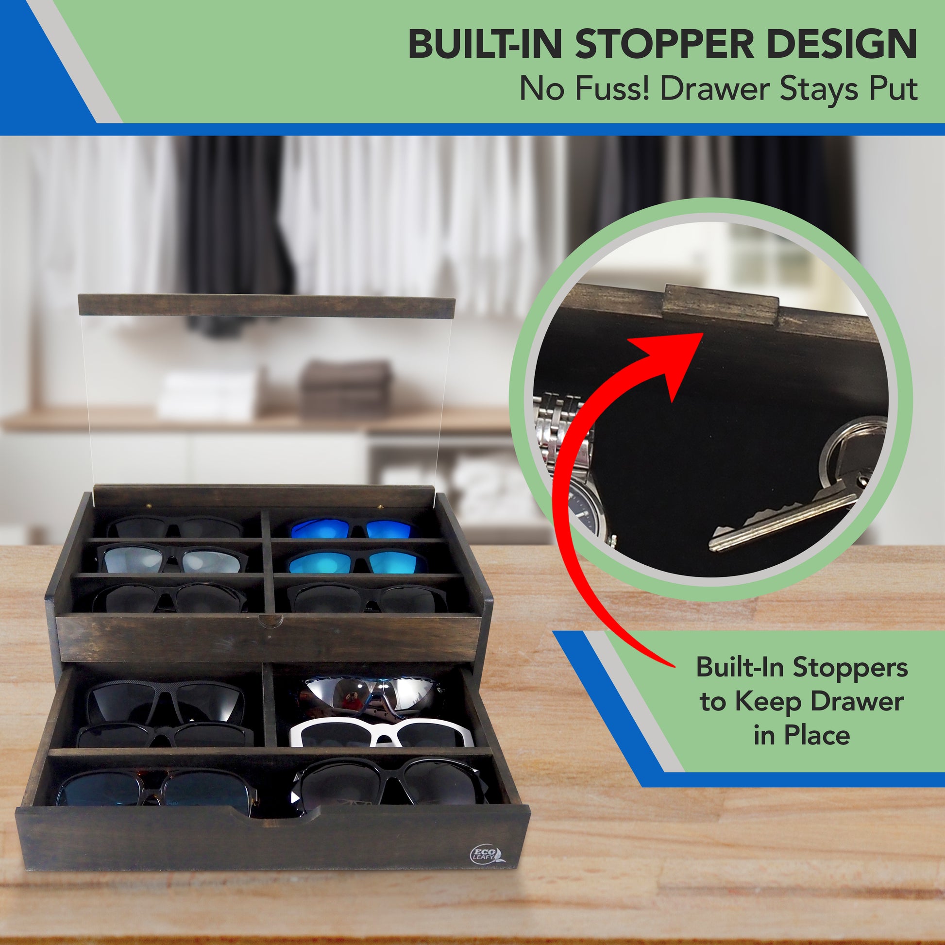 🔒 No Slips. Ever. – Our sunglass organizer features built-in drawer stoppers that keep everything in place. No more realigning or accidental slips—just smooth, reliable access to your eyewear or sunglasses plus essentials, every time!