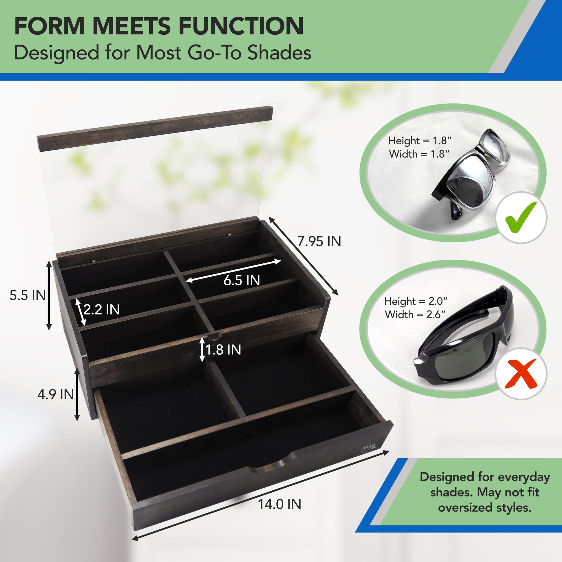 🕶️ Form Meets Fit – Our sunglasses storage box is thoughtfully designed to fit most standard-size sunglasses, eyeglasses & fashion frames. Each compartment in this sunglasses stand is sized for go-to styles, though bulky or oversized shades may not fit.
